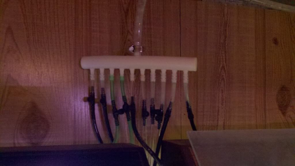 The rise/drop outside of water has no effect. The pressure difference from water height will be your issue. I have gate valves on all of my lines 40+ and set each line individually. I use 3/8 flexible hose to go around the room. 1/4 lines to each sponge.