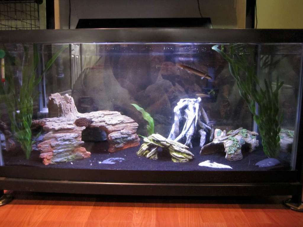 40 breeder with pair of Kribs, and juveniles of senegal bichir, african brown knife, leaf fish (ctenopoma), and an upside down catfish