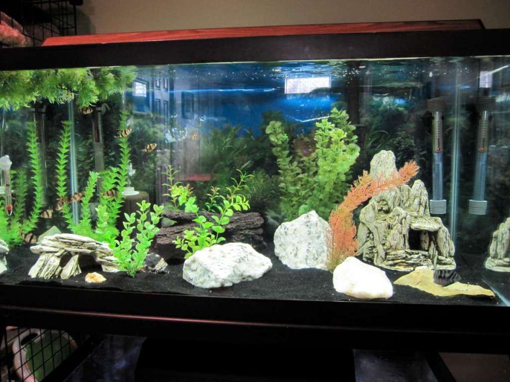 40 breeder with pair of Honduran Red Points, school of tiger barbs, one rainbow shark, and a very small pleco