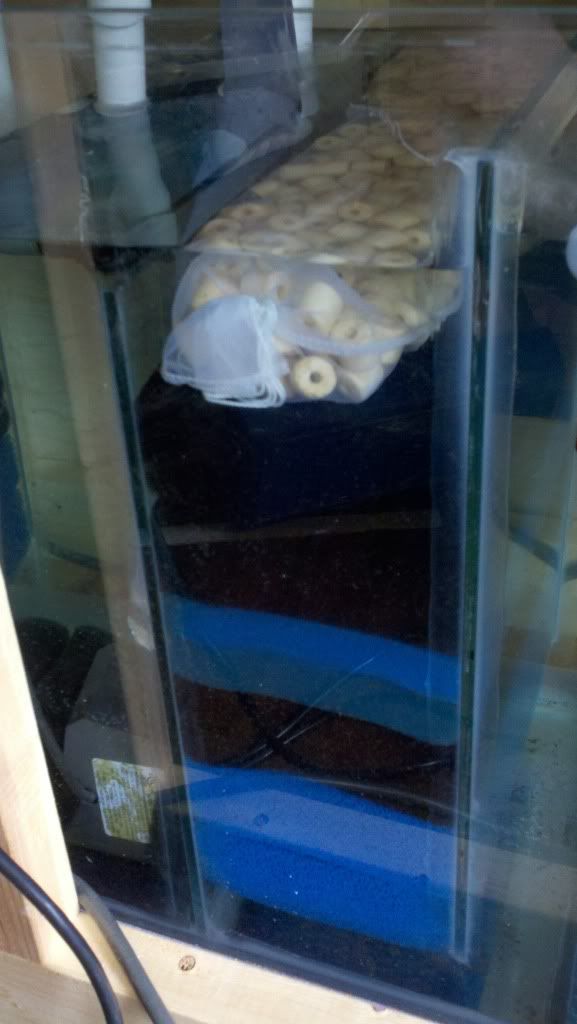 I cut the poret foam for the filter, put the sand in the main tank, put the fluorite into the sump refugium, grabbed some ceramic rings from my 125's sump and dropped in a handful of juveniles males to grow out and be joined by the big boys in a month or so.