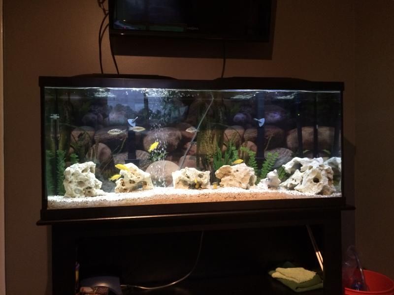 This is his 55g that he has in his bedroom. Its a little stripped of his Texas holey rocks as we had to steal some for the 125g to help jump start the cycle. Filtered by 2 Marineland Penguin 400's