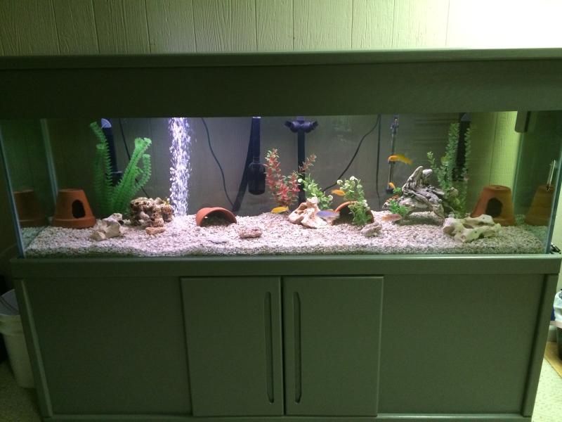 This is the 125g that he talked us into putting into the basement. It still needs some work but that will come in the next month or so. Filtered by 2 Marineland Penguin 350's (hope to sell or trade them) and a Fluval FX6. He hates the decor as he is a Texas holey rock lover and even wants crushed coral but like stated before that stuff will come in time.