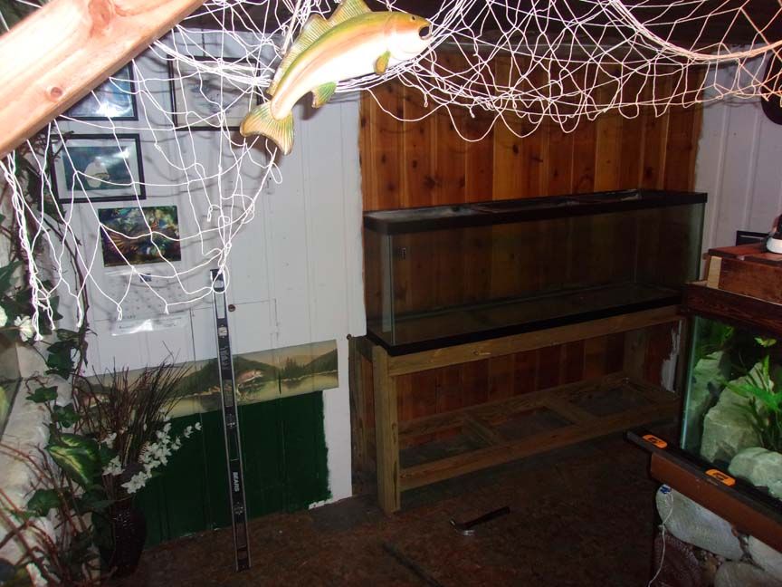 Basically that back wall is a fake wall that is about 12" out in front of the actual back wall. The back wall behind it has 12" deep shelves built into it. So plans are to remove the fake front wall, tear out the shelves, then that will make it so the tank will fit back into the wall and will only stick out from the wall by about 6". Then I'll be rebuilding the wall around it so it is built in and have the top part of the wall hinged for tank work.