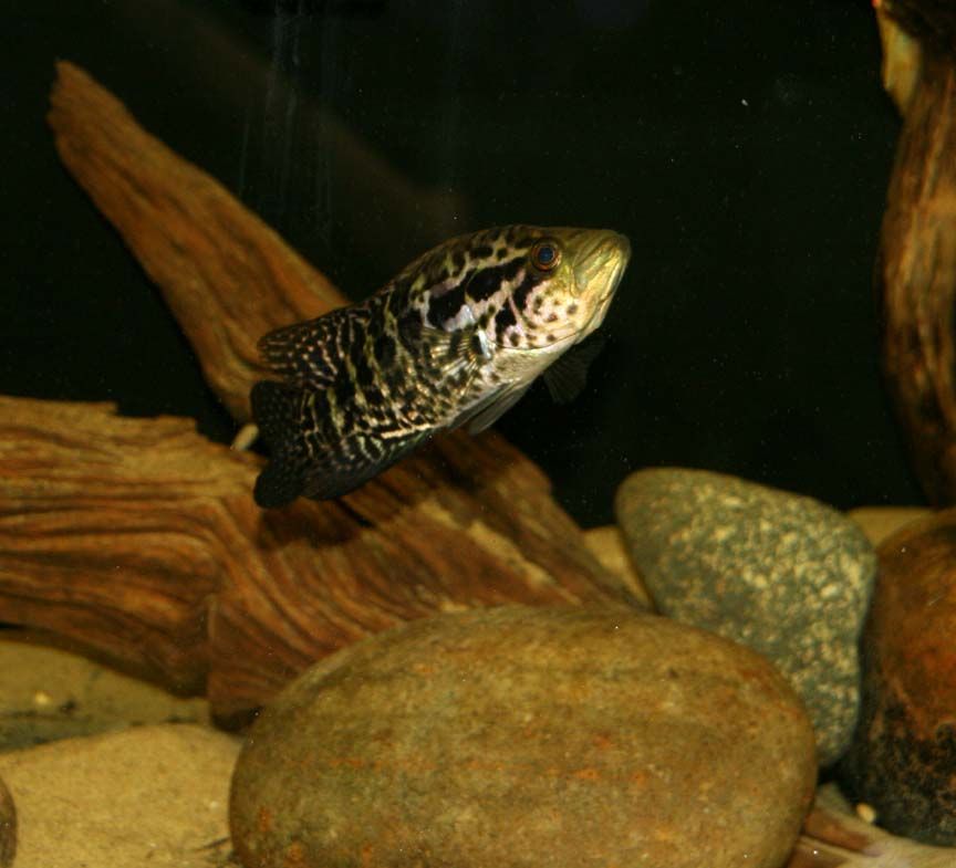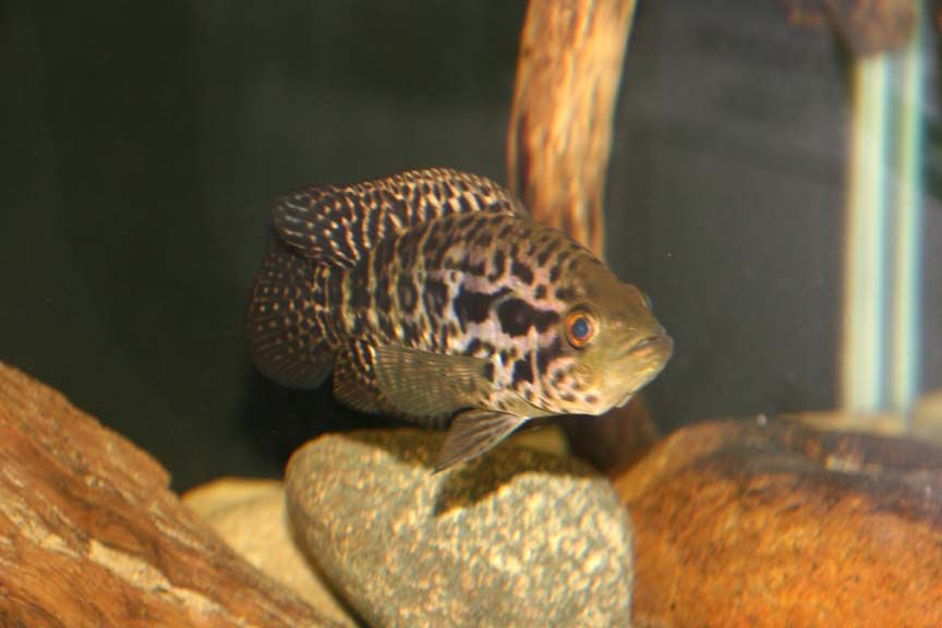 He's doing awesome Blair. Having the whole tank to himself seems to be sitting very well with him. His only tankmate is a 5" male albino BNP just to help keep the glass clean. Once the jag had been in this tank for a few days his colors changed so much for the better. He was really dark when I had him in the Bleekeri tank while I was getting this tank set up for him. Now he's lightened up a lot and taken on the nice pattern that jags are known for. Only going to keep getting better looking as he starts growing.